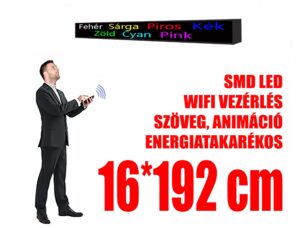 Ez a nagy fényerejű, P10 kültéri LED fényújság mozgó feliratokhoz és animációkhoz ideális. Egyszínű fényreklámként több színben is elérhető: piros, sárga, kék, zöld, rózsaszín, fehér és cyan. Wifi vezérléssel és ingyenes telefonos applikációval könnyedén irányítható. Alacsony fogyasztású SMD LED-ekkel